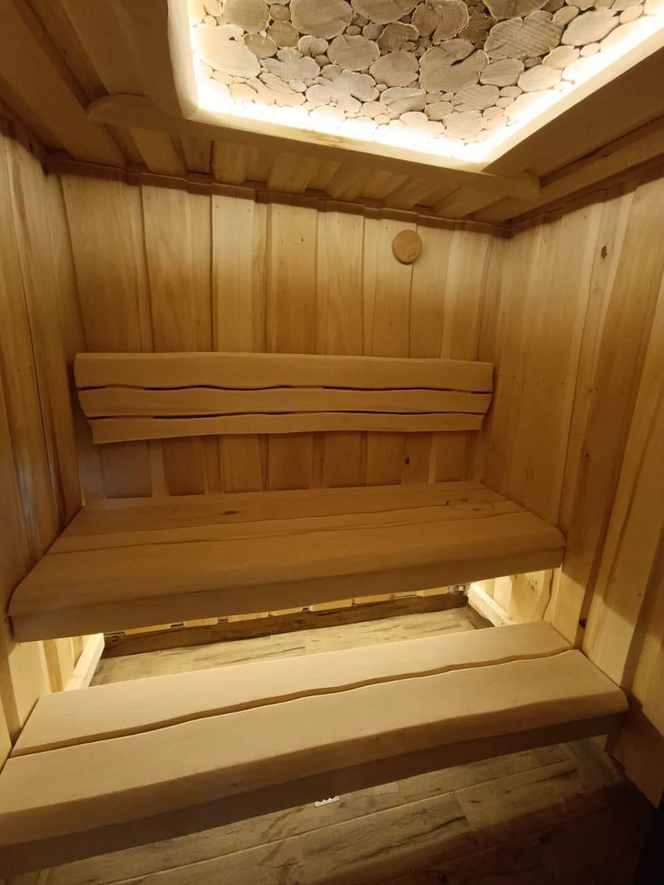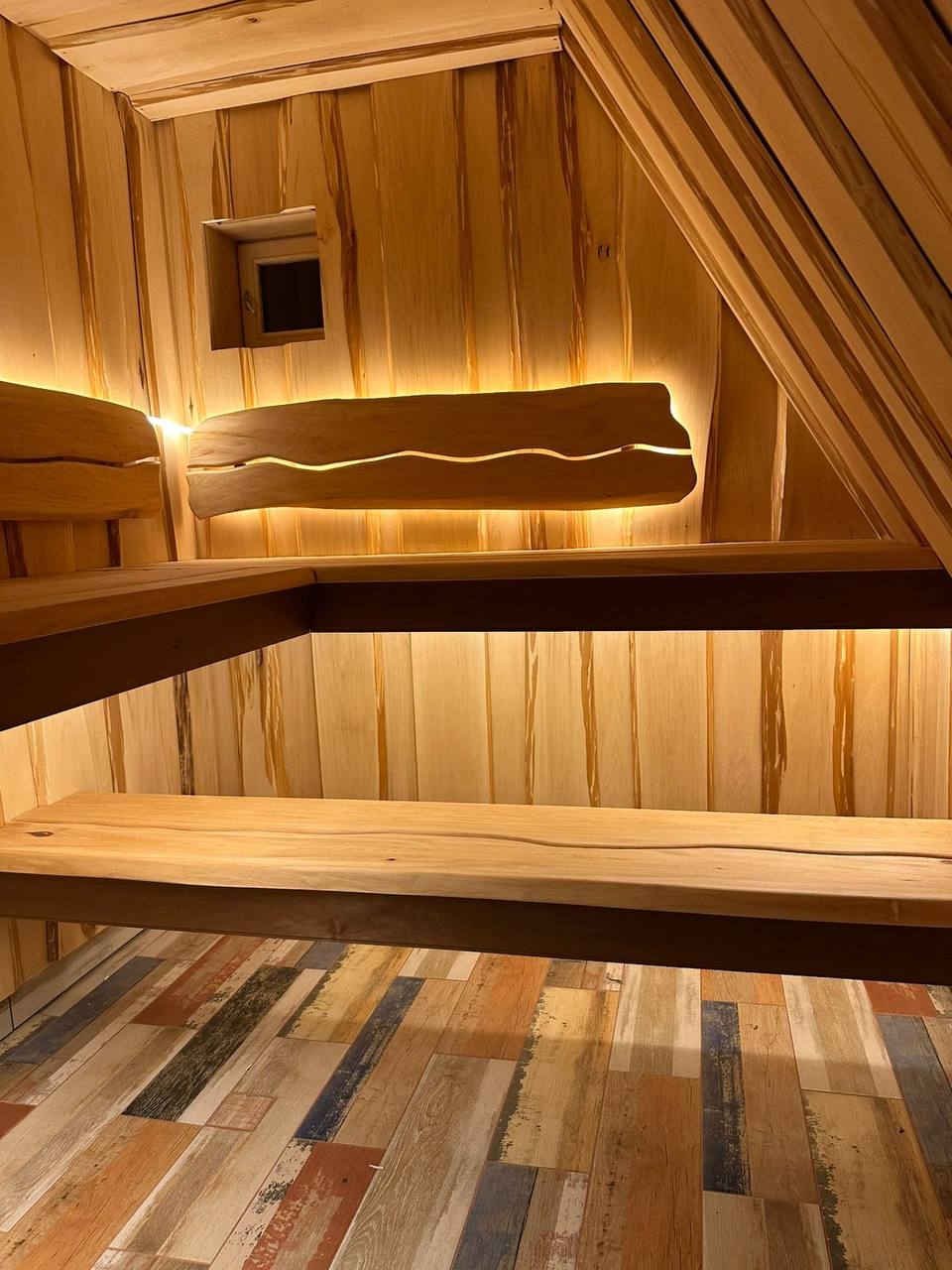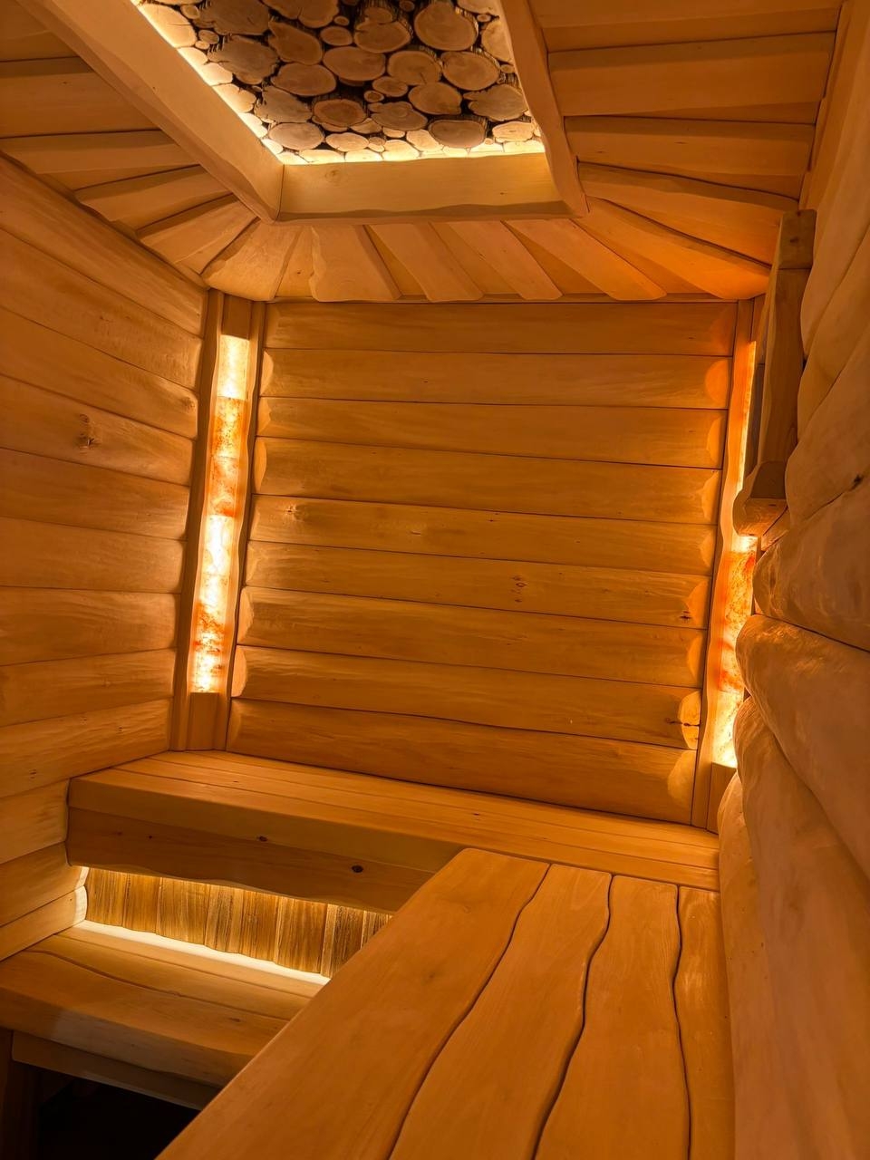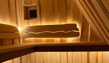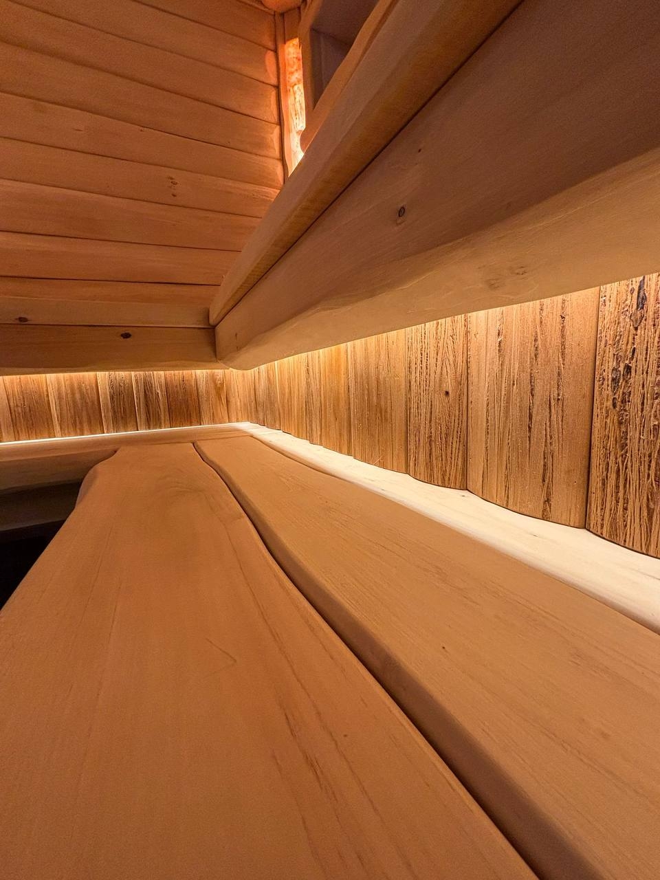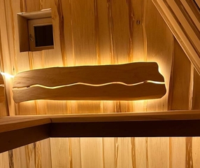 Световые акценты, выстроенные по контуру интерьера, раскрывают красоту дерева и создают в бане невероятно умиротворяющую атмосферу.